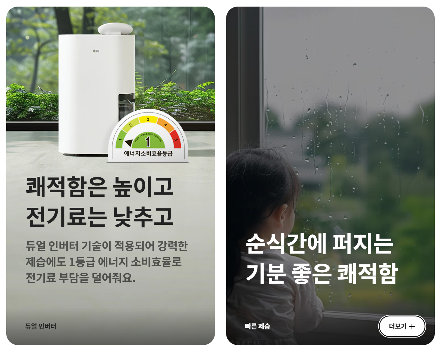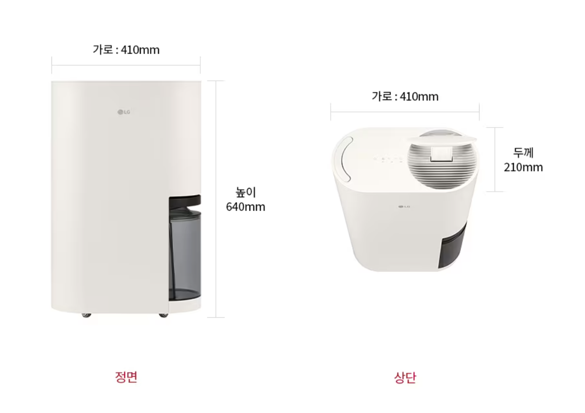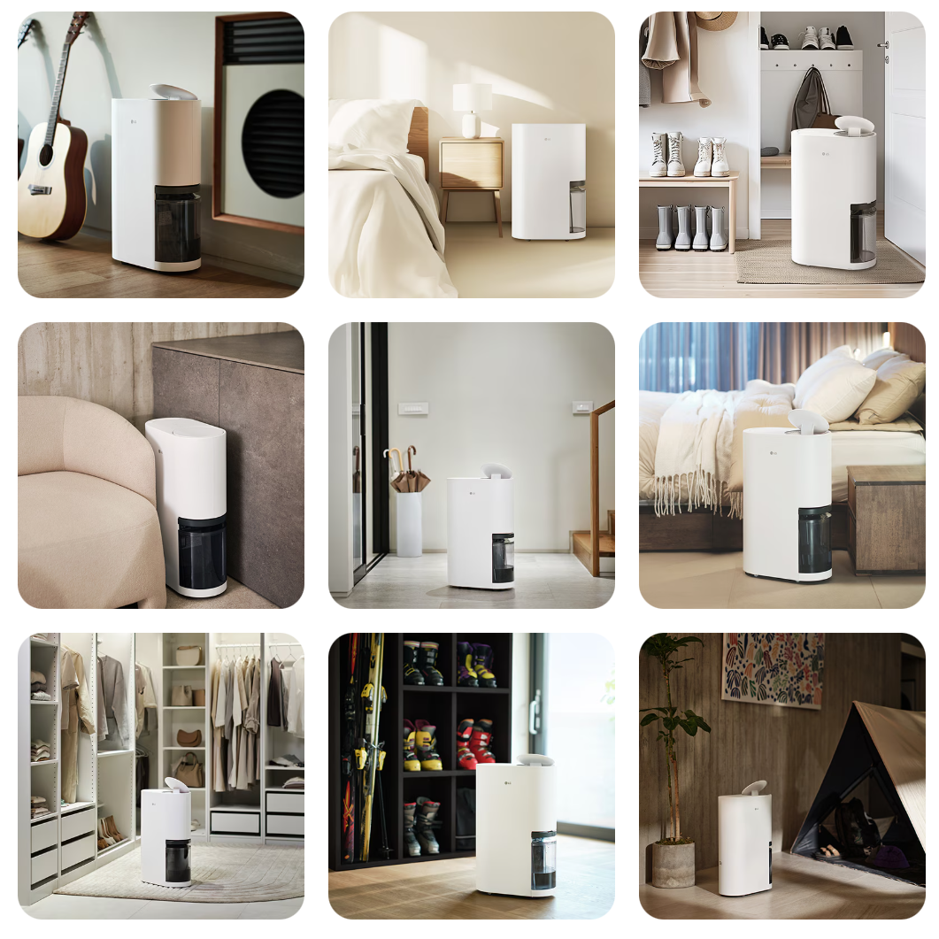 LG의 프리미엄 인테리어 가전 라인답게 세련된 카밍베이지 컬러와 미니멀한 직사각형 디자인을 채택했습니다. 기존 제습기의 투박한 이미지를 벗어나 거실이나 침실 어디에 두어도 인테리어와 자연스럽게 조화됩니다.