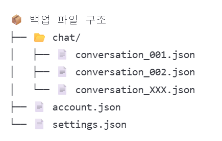 각 대화는 독립된 JSON 파일로 저장되어 있어, 필요한 내용만 선별적으로 추출하거나 분석할 수 있습니다.