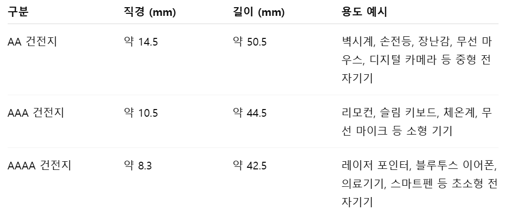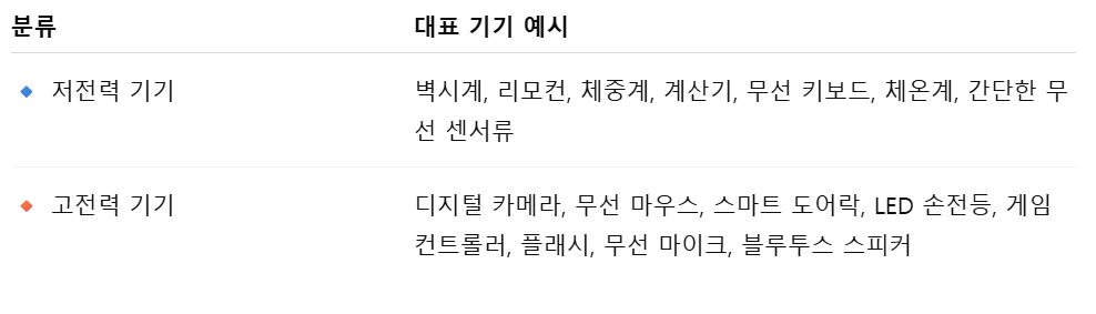 - 예외: 무선 도어센서, 블루투스 태그 등은 AAAA 또는 리튬 전지가 더 안정적