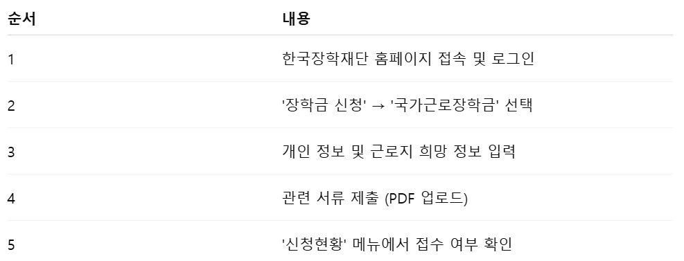 신청은 한국장학재단 홈페이지에서 온라인으로 진행되며, 로그인 후 순차적으로 정보를 입력하는 방식입니다. 다음 표는 신청 절차를 요약한 것입니다.