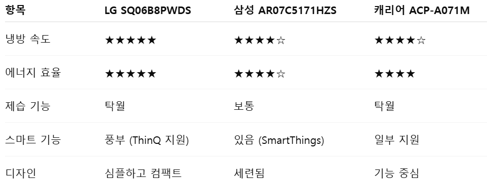 비슷한 스펙의 타 모델로는 삼성전자 AR07C5171HZS나 캐리어 인버터 벽걸이형 ACP-A071M이 있으며, 다음과 같은 비교 포인트가 있습니다: